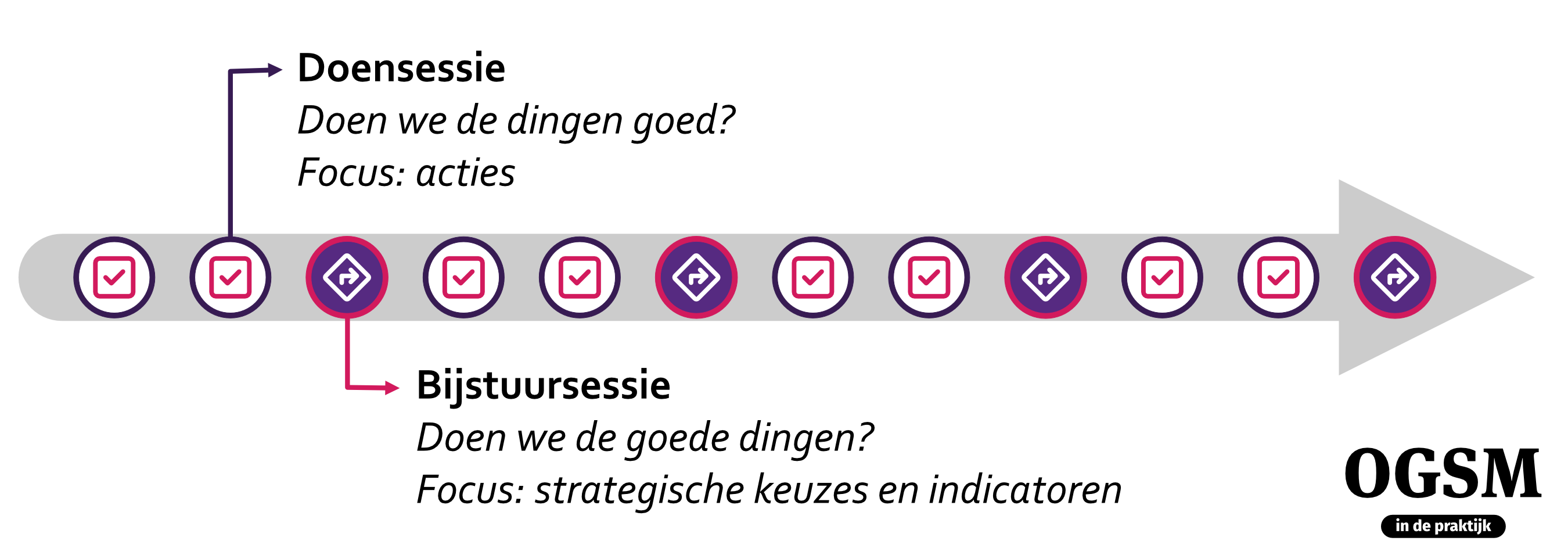 In het boek ‘OGSM in de praktijk’ geven we een volledig overzicht van de voorbereiding en de agenda van de doen- en bijstuursessies.