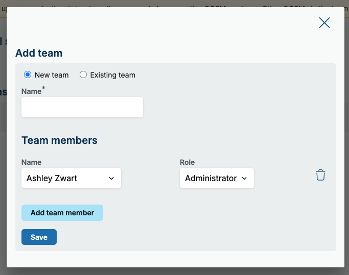 - Start with the team that is at the top of the hierarchy, such as the executive team or the management team. Click the top button 'Add team'.