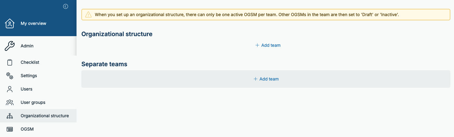 - Use the 'Add new team' buttons to create the organizational structure. Below the horizontal line, you can add teams that fall outside the hierarchy, such as programs.