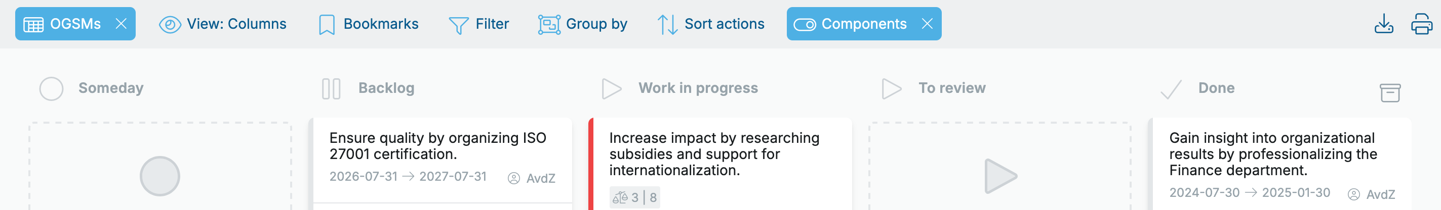 On the Actions page, you see the actions from an OGSM displayed in columns. These columns represent the status of the action: